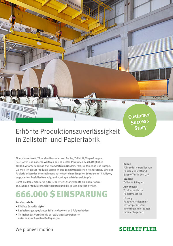 Ein weltweit führender Hersteller von Papier, Zellstoff, Verpackungen und Baustoffen hatte über einen längeren Zeitraum mit häufigen, ungeplanten Ausfallzeiten aufgrund von Lagerschäden zu kämpfen. Dank der Lösung von Schaeffler konnte die Papierfabrik 36 Stunden Produktionszeit einsparen und die Kosten deutlich senken.